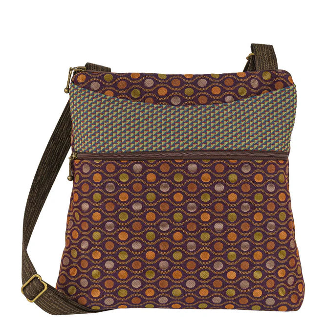 A top favorite! Adjustable 1” web strap. Main compartment has a top zipper, spacious interior, and small open pocket. Two exterior pockets - one open (6.5 inches deep) for fast access and one zipped. A generous pocket on the back holds a water bottle. The bottom is 2” boxed. This bag is fantastic!