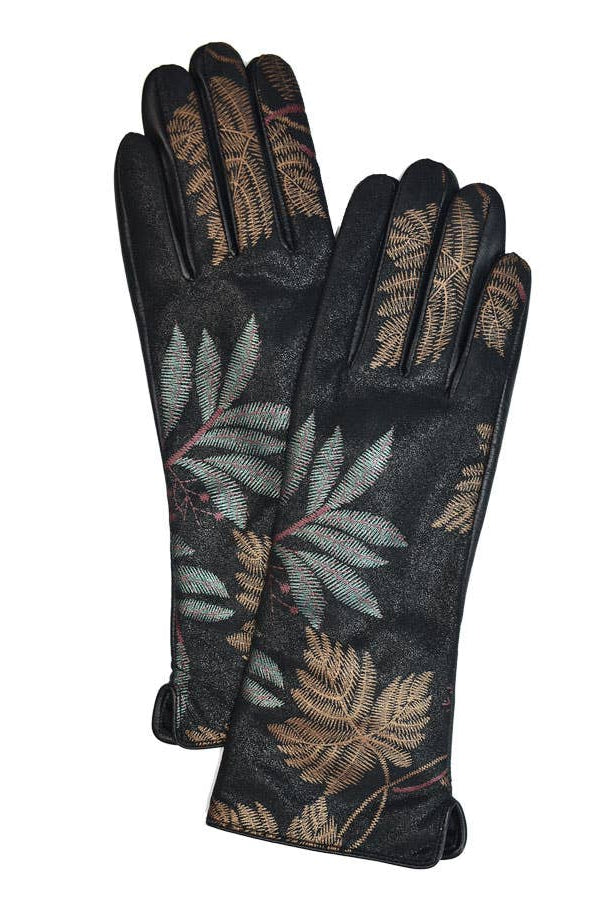 Make a statement with these leaf print, genuine leather gloves featuring ruched detail at the cuff and velvet liner. The soft leather boasts a subtle printed pattern in a metallic sheen, perfectly suited for the season. Pattern variation per piece does occur and is part of the unique charm of this design.