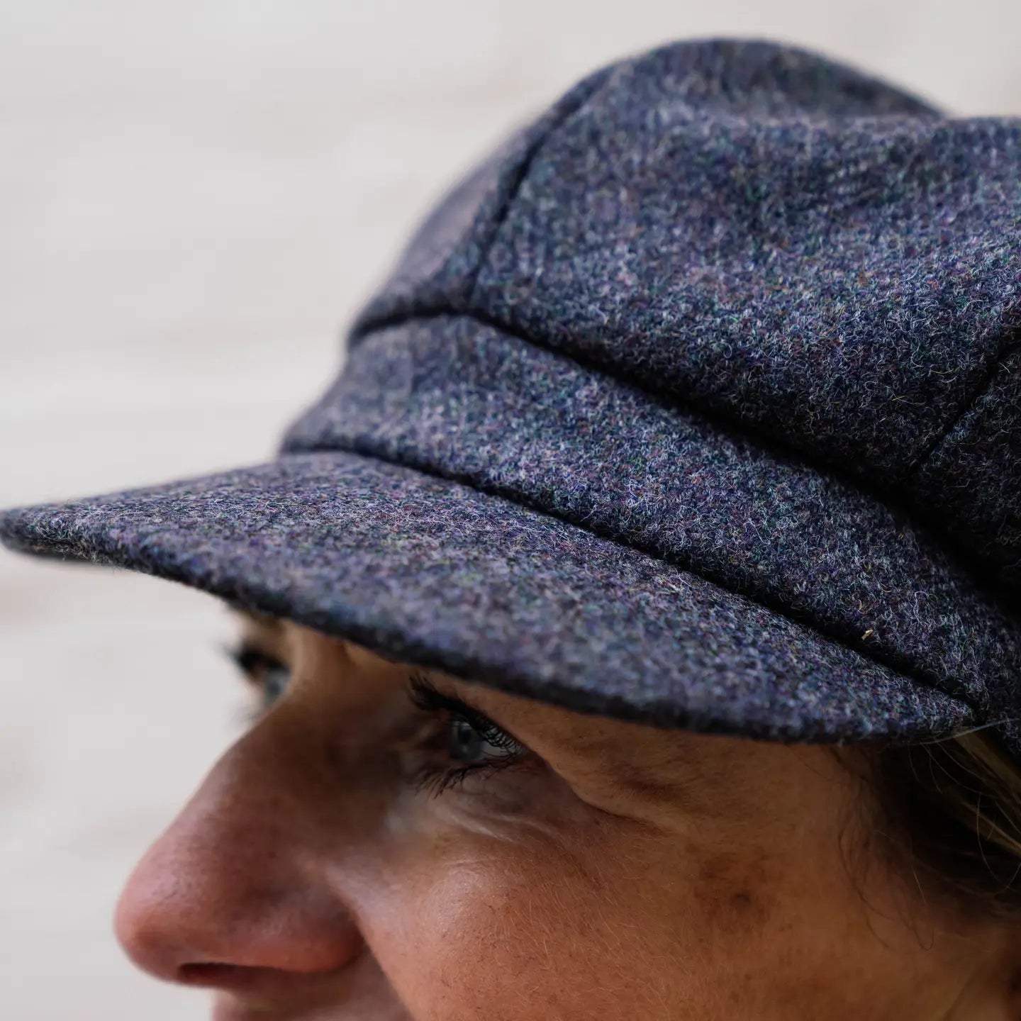 This ladies baker boy style cap is made from high quality Yorkshire wool in a stylish tweed weave. Its a great hat to add style to your every day wardrobe. It has a peaked brim and an 8 panel crown, finished with a fabric covered button to the top.