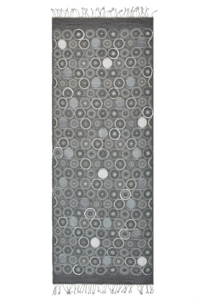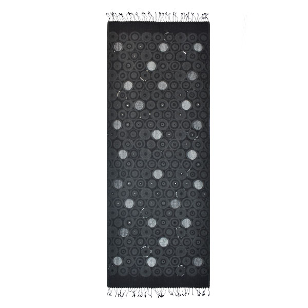 Special occasion shawl features contemporary circle motif, woven in varying sizes and shades, with semi-sheer panels, sequin, and beaded outlines.