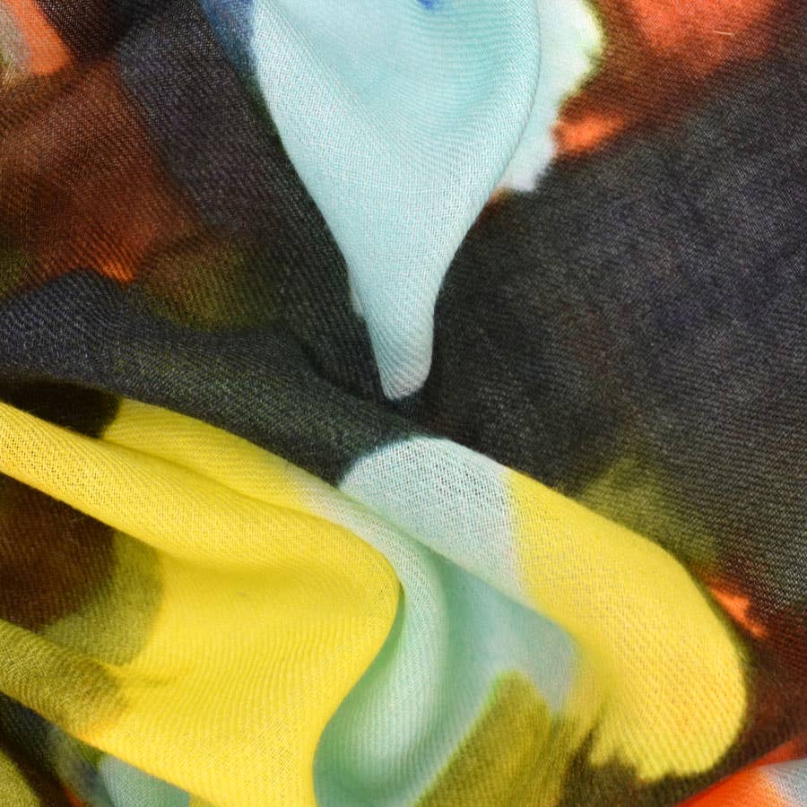 Wide brushstrokes create an abstract floral motif. An artful digital print scarf on a soft, and perfectly size, wool.