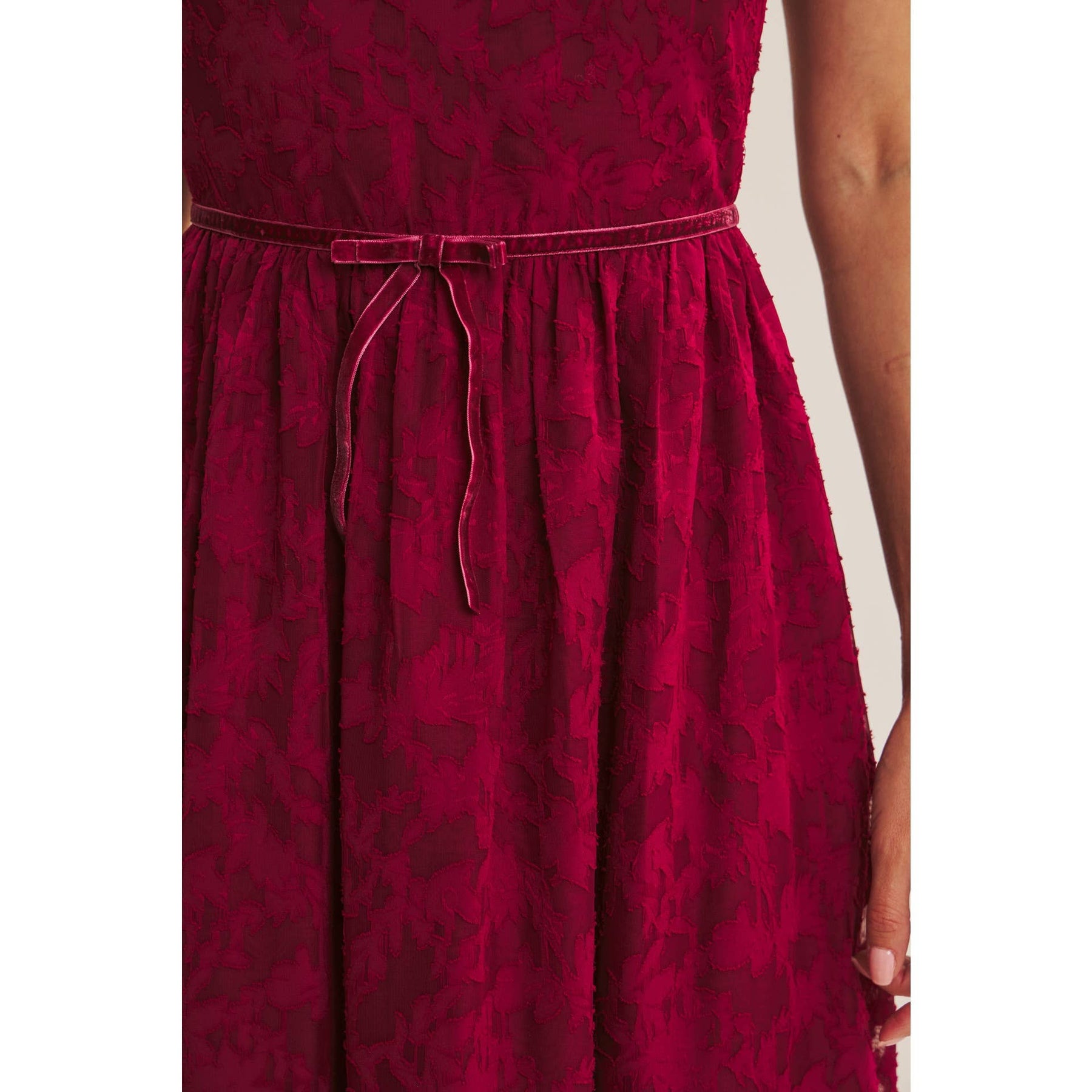Rich in texture and full of festive charm, this holiday-ready midi dress is your statement piece for the season. Crafted in intricate jacquard with a delicate velvet waist tie, it flatters with a romantic sweetheart neckline and fluttering ruffled shoulders. The deep hue captures a timeless elegance, perfect for winter weddings, seasonal soirées, or candlelit dinners. Fully lined for comfort, with a concealed back zipper for a clean finish.