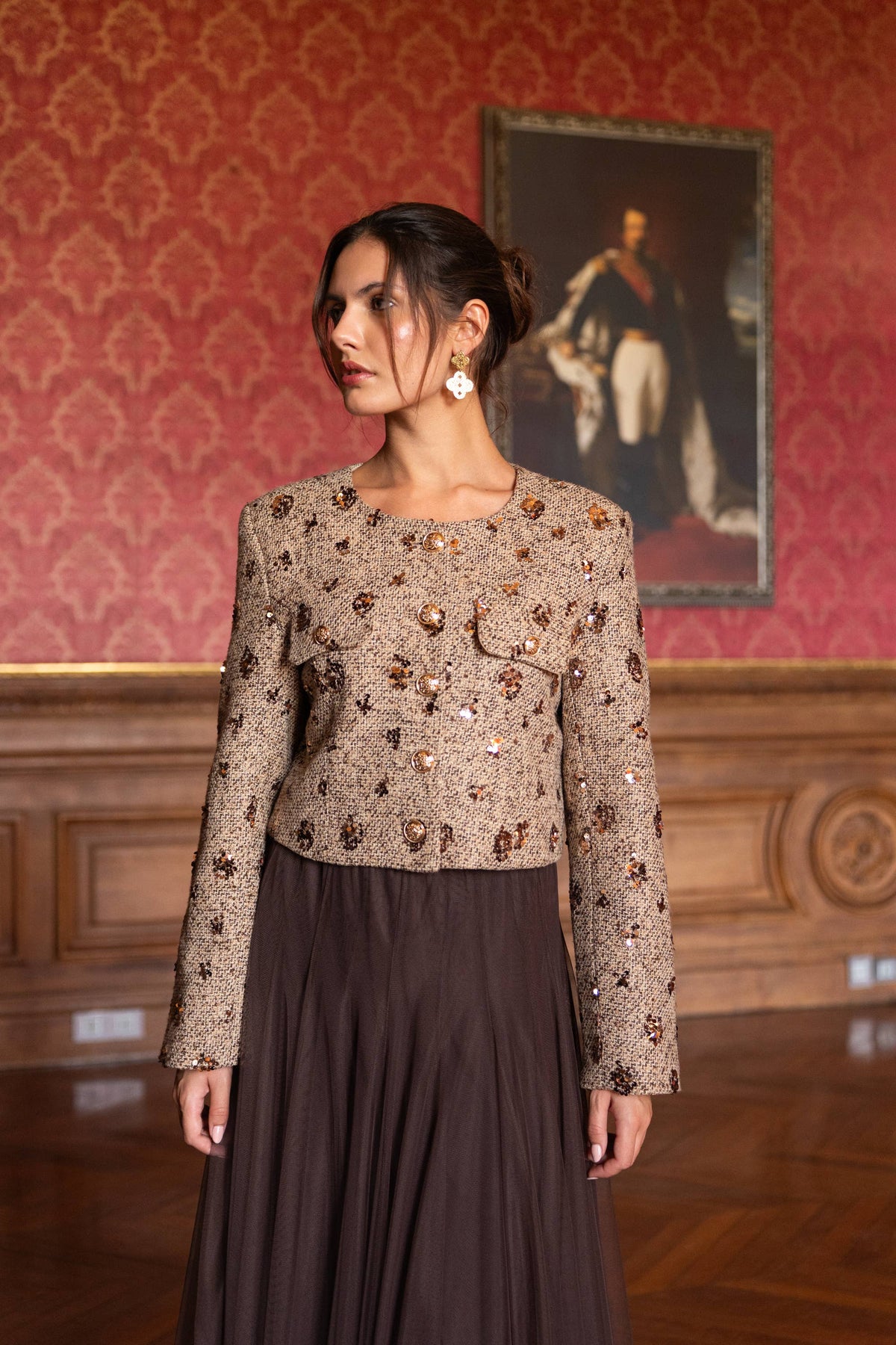 Details: Textured tweed enhanced with discreet sequins and gold threads for a sparkling effect without excess. Two flap patch pockets on the chest, buttoned to emphasize the piece's retro-chic aesthetic. A chic and modern piece, ideal with jeans or trousers for an urban or sophisticated look.