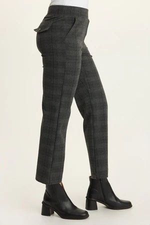 Plaid Ponte and a bell-bottom silhouette bring some vintage-inspired edge to this pull-on pant complete with subtle pockets on either hip.