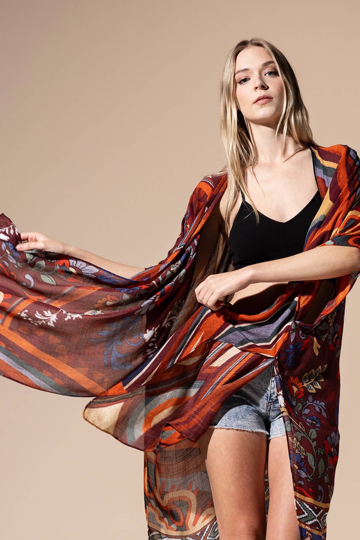 The Retro vibe Kimono is a vibrant blend of rich colors and unique patterns reminiscent of past eras. Lightweight and stylish, it adds a distinctive flair to any ensemble with its retro-inspired design. 100% Viscose.