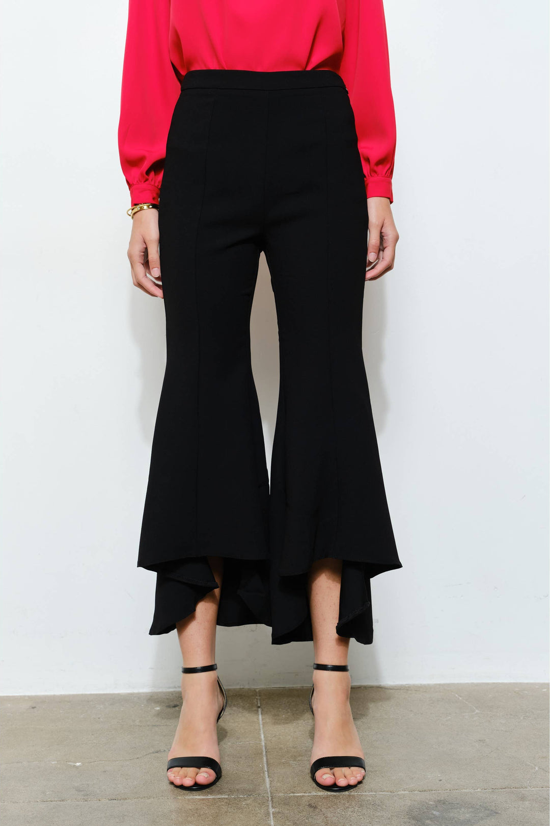 Draped Ruffle High-Low Flare Pants
