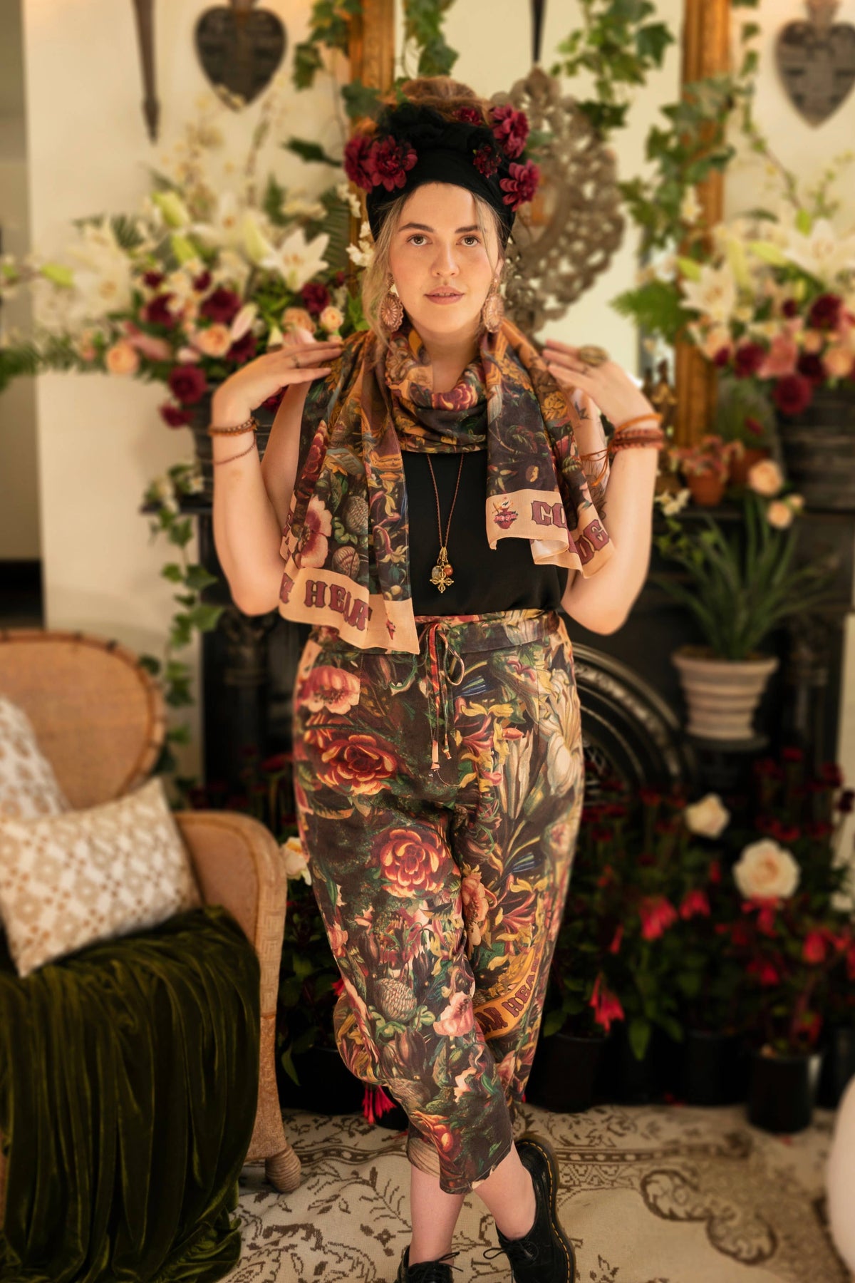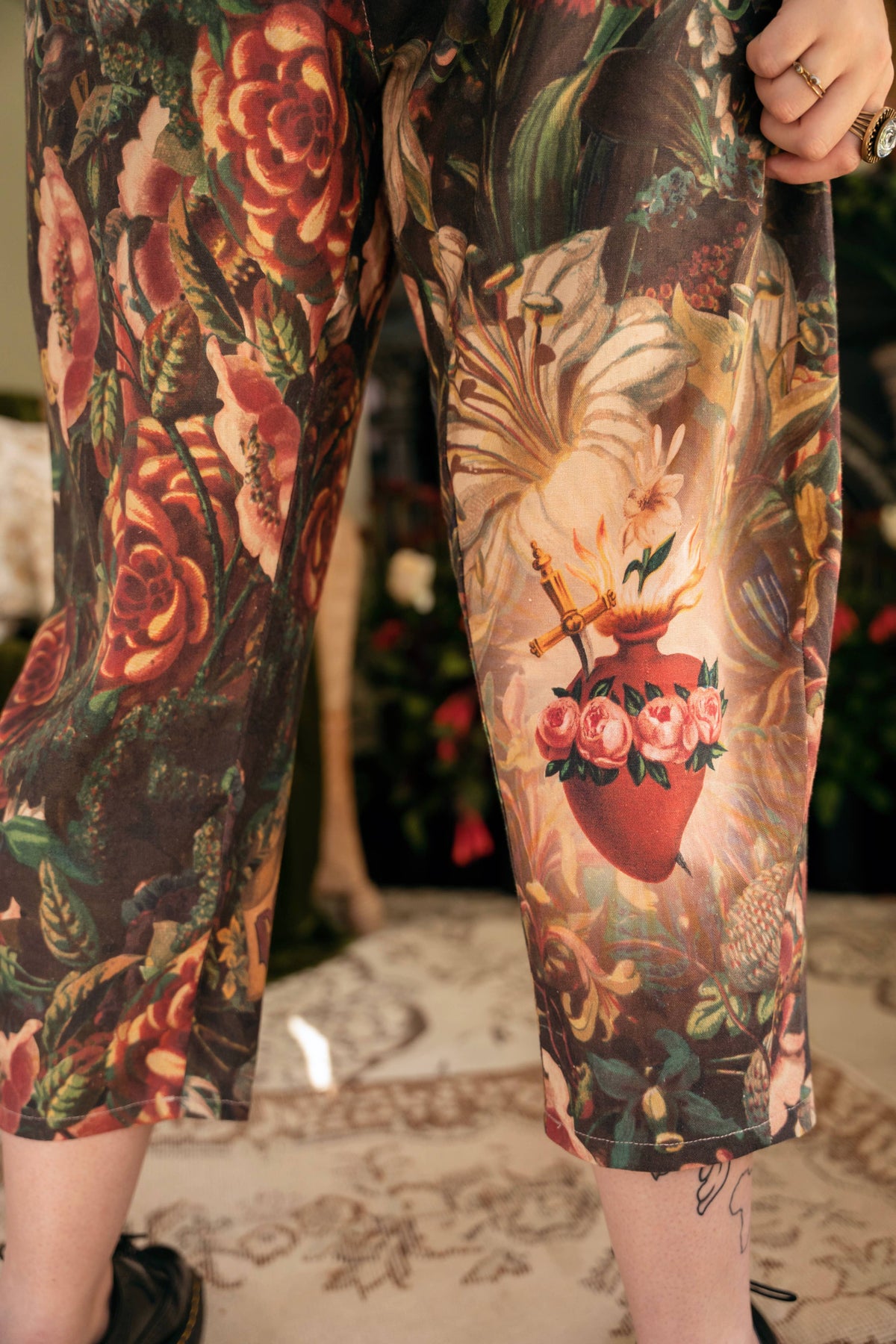 Our beautiful Artist Pants are made from a natural blend of linen and viscose, and feature a drawstring front, elastic waist back panel, pockets, cropped length, and a flattering lantern hem. The custom-woven fabric is easy-care and so comfy. About the Print: Love, faith, and courage — we designed this piece as a reminder to keep all three close when the road feels long!