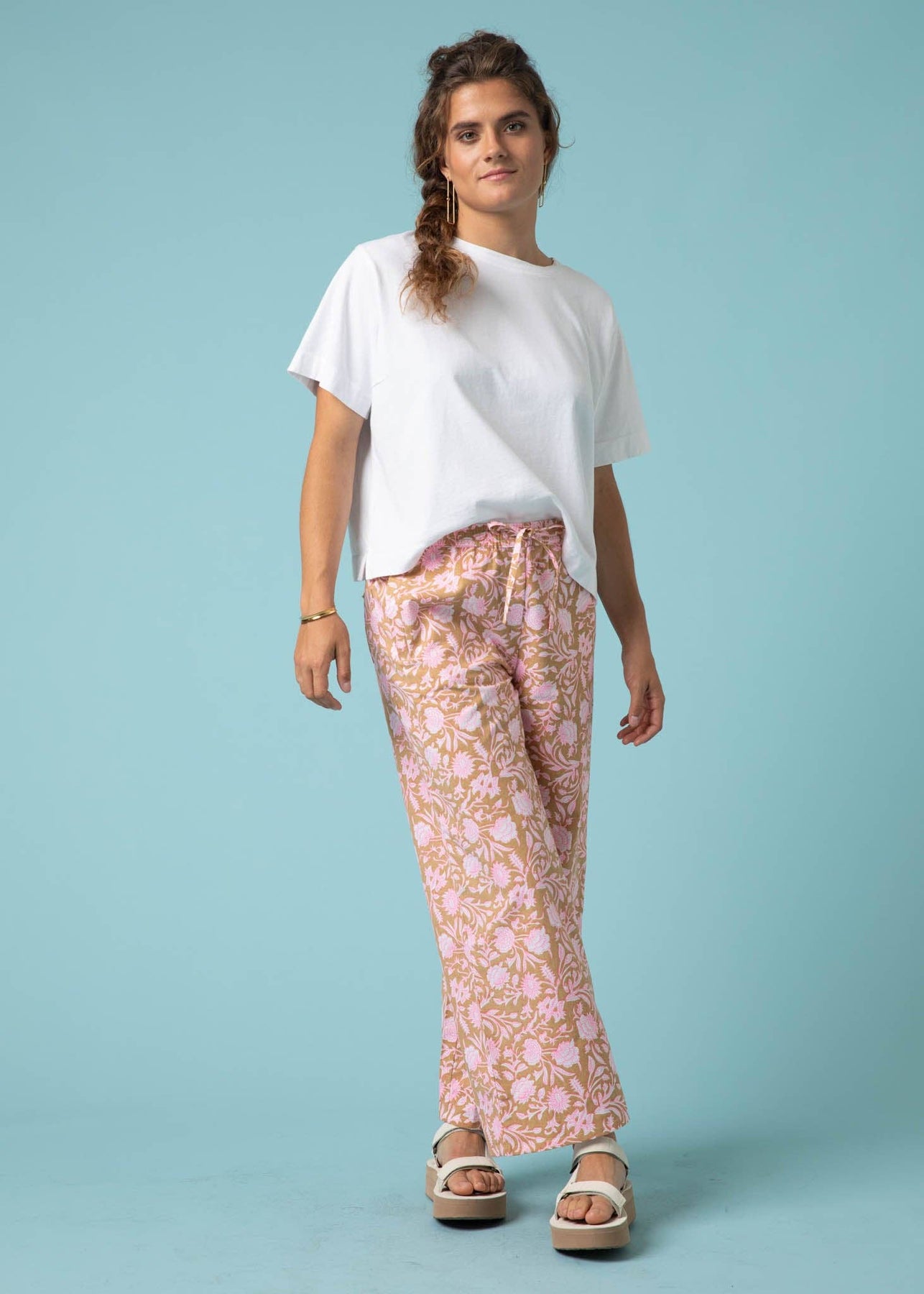 * Organic cotton twill * GOTS certified * Inseam: XS/S 26", M 26.5", L/XL 27", 1X/2X 27" LONG +3.5" * Relaxed fit with elastic inset waist * Exterior draw cord at center waist * Back slip pocket with frayed edge * Side welt pockets * Hand loomed & block printed * Machine wash * Made in India