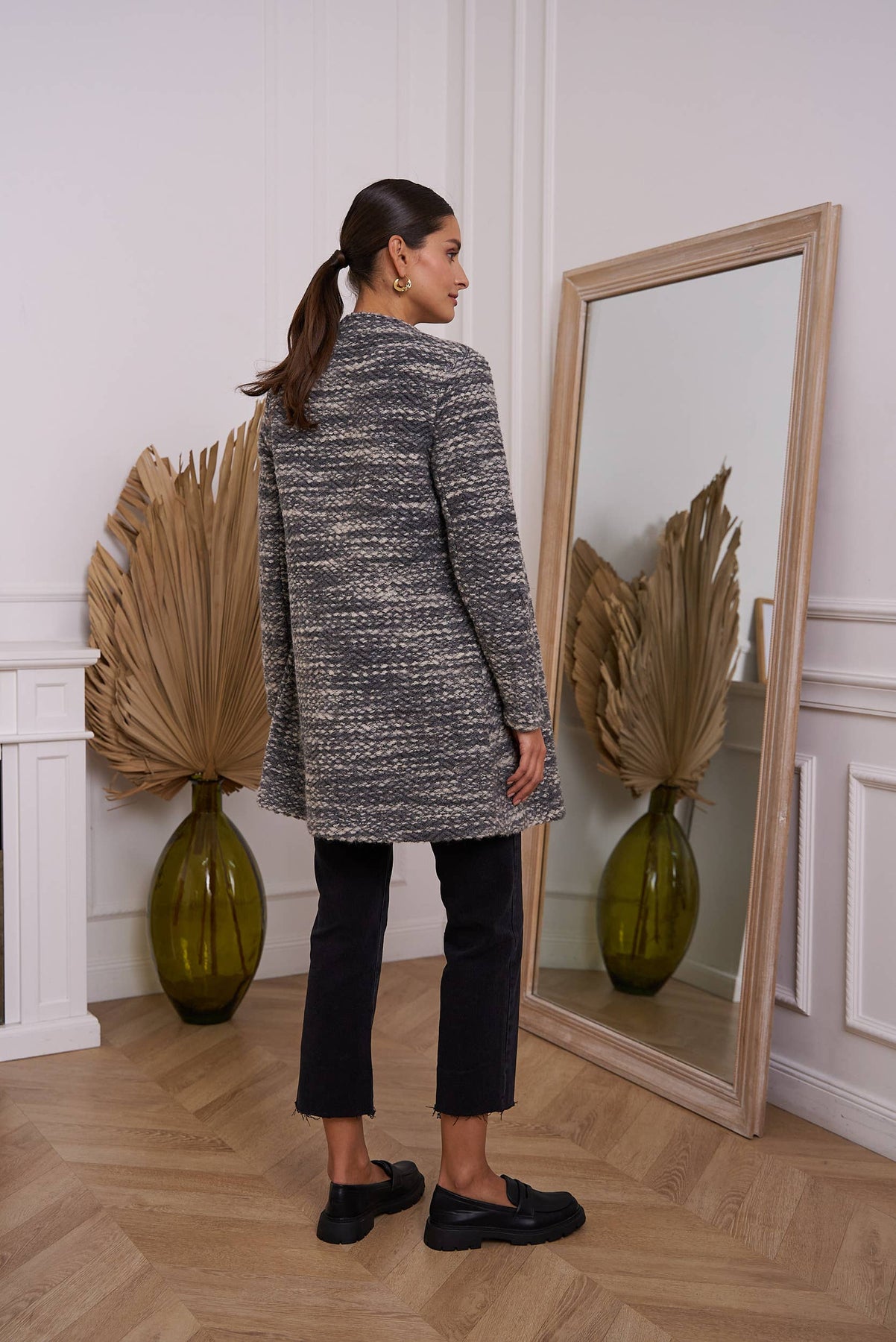 Thick wool jacket:  long sleeves - open collar - mid-length. Gorgeous. Easy. Dress it up or down - either way you will be comfortable and in style. From Paris.