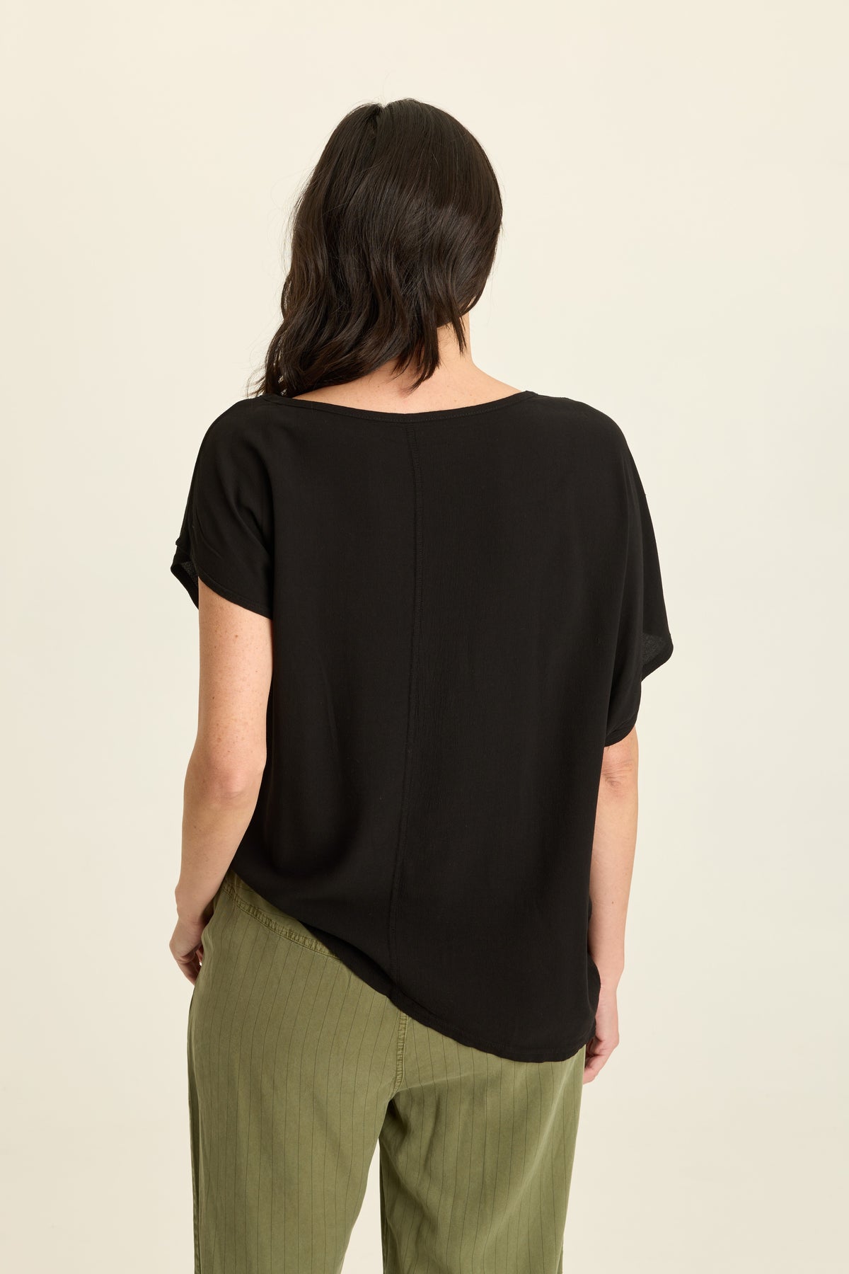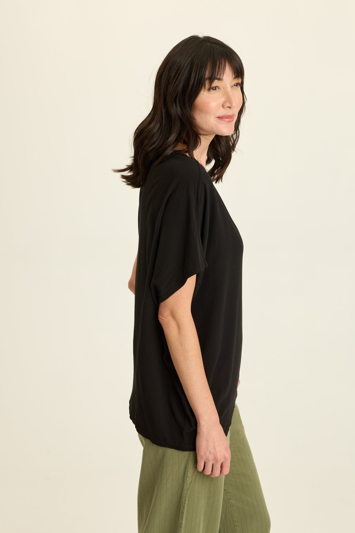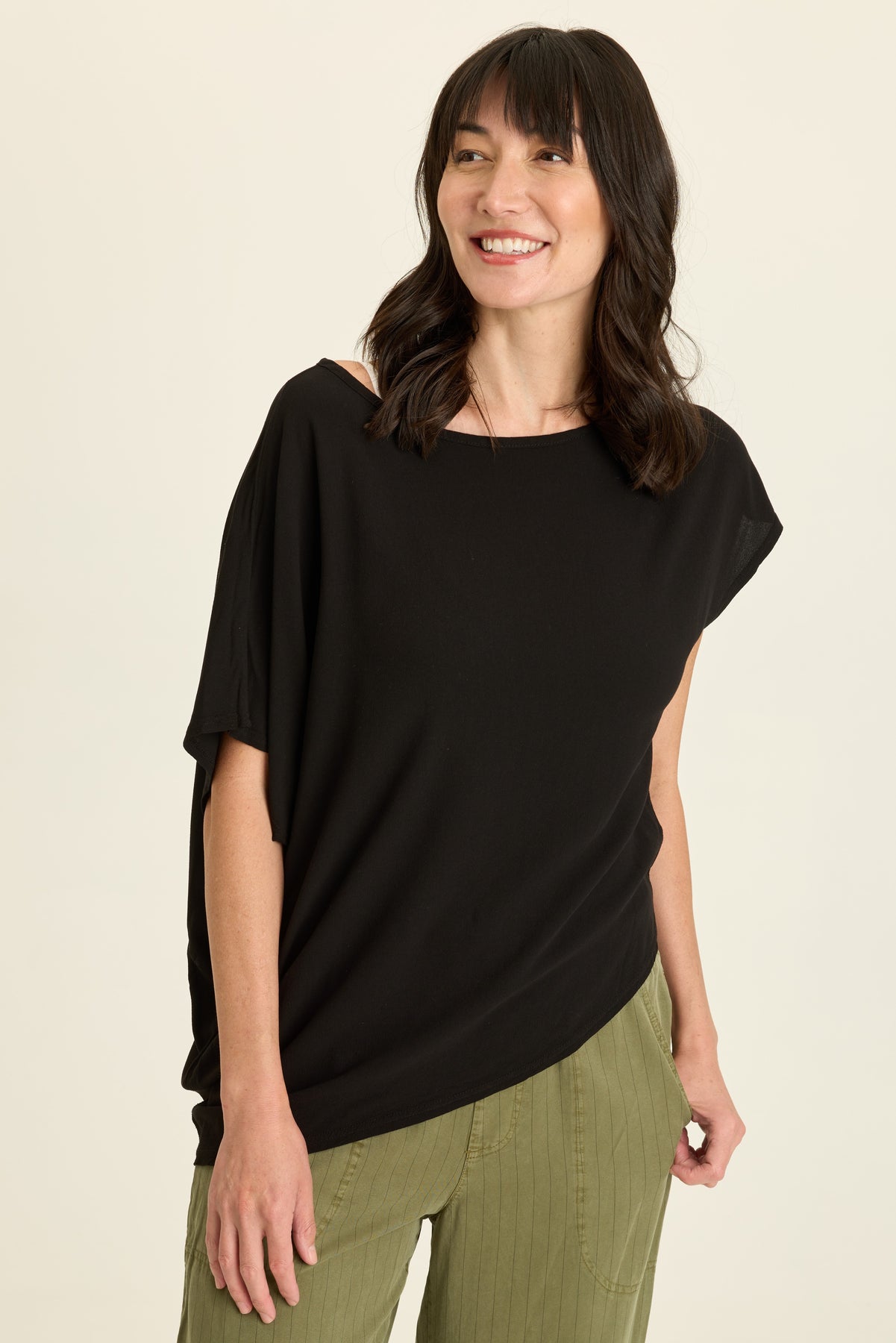 An asymmetrical hem and sleeve are all the drama in this lightweight crepe top.