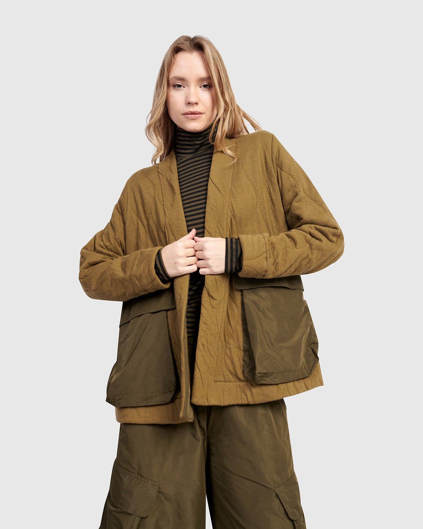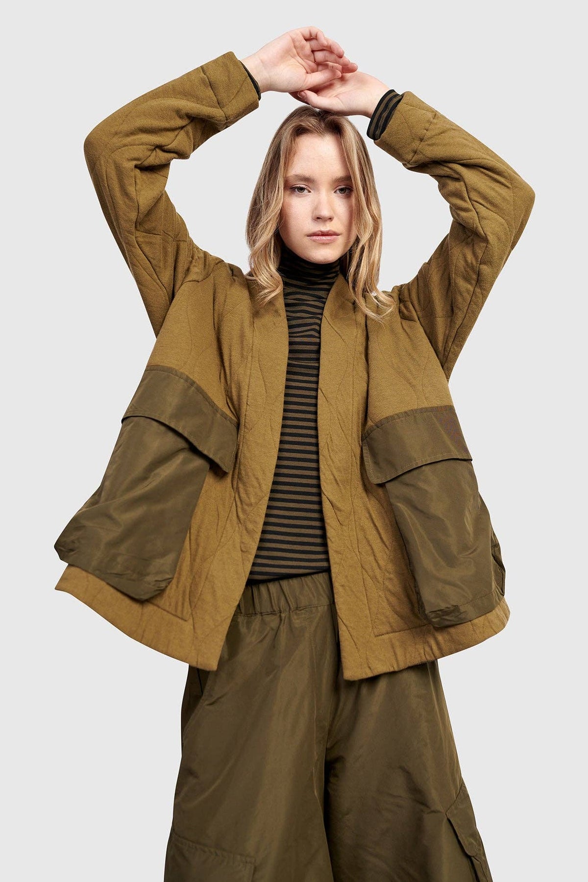 Materials & Care * Soft double-sided quilted knit with taffeta accents * 65% Cotton + 35% Polyester Product Details * A-line * Below hip length * Loose extra long sleeves * Open front with swingy reinforced lapels, oversized patch front pockets * Style: UJ648K
