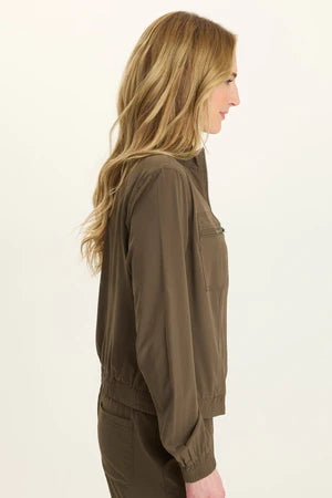 Ooooohhh! Look at this clean cut bomber. No extra fluff here, just easy and cool like a breeze through the trees. Quinn is the quintessential update to your bomber game! Ruched hem and cuffs, plus a smooth draped fabric equals putting one of these in your cart.
