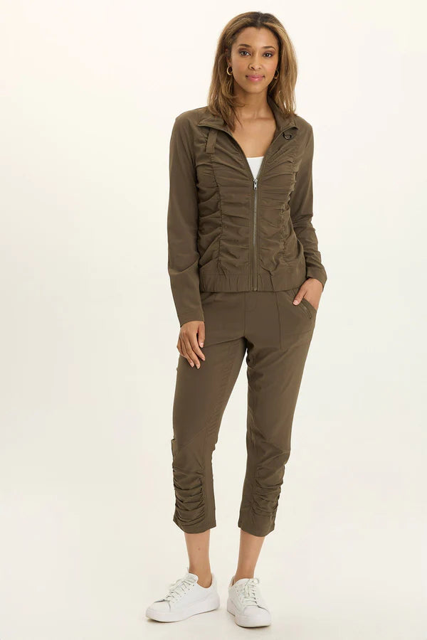A Jetter spin off; this active legging features a drawstring waist, front pockets with zipper details, our classic ruched leg panels, back pockets and enough sass to keep you going all day!