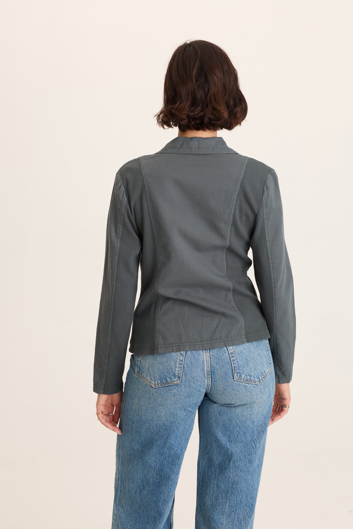 A clean and simple blazer style jacket, Brax has 2 pleated pockets, a one brass button closure and knit panel inserts for maximum comfort.