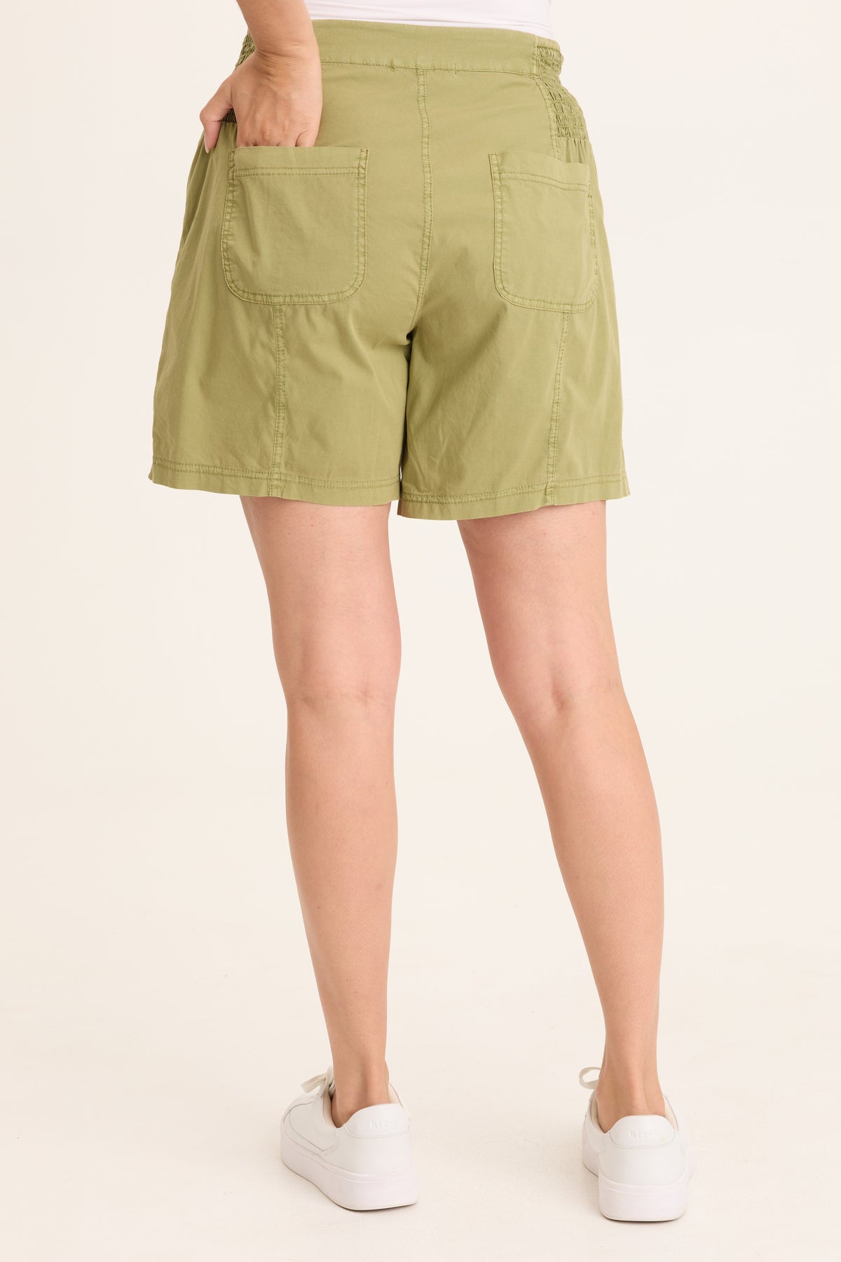 Side elastic smocked waistband pair up with front/back pockets, a drawstring waist and seamed details in this easy to wear short.