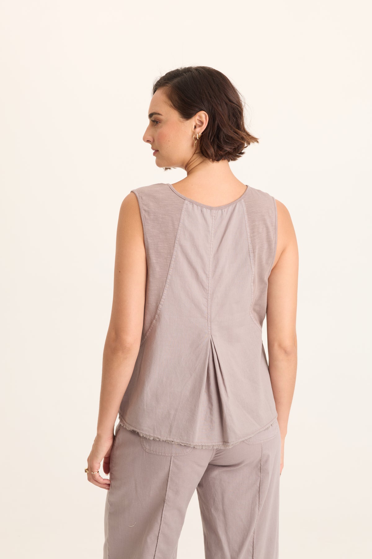 This v-neck tank features slimming seams, contrast jersey and a double inverted pleat at the center back.